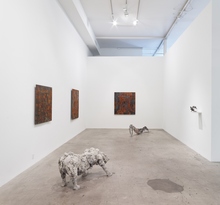 Lionel Sabatté is a painter and sculptor based in Paris and Los Angeles. He is interested in the living and in the transformations of the material caused by the passage of time. In Transfigured., Sabatté will show his “Oxidized” paintings and Bestiary sculpture. For the paintings, he uses an acidic medium to create oxidized gestures across a metal surface, causing organic explosions and astral convolutions. They are direct and incisive, yet corrosive. In the act of creating the abstractions he cruelly devours the plate, as if the painting expresses itself in the rusty web. He will also show two figurative sculptures from his bestiary of concrete animals. These animals (a bear and a dog) are built in clay-like increments of concrete and steel, as if they are emerging from an excavated site. This is Lionel Sabattés first exhibition with the gallery.